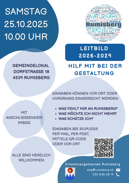 Der Gemeinderat Rumisberg lädt alle Einwohner zur Erarbeitung des Leitbild 2026-2029 ein.